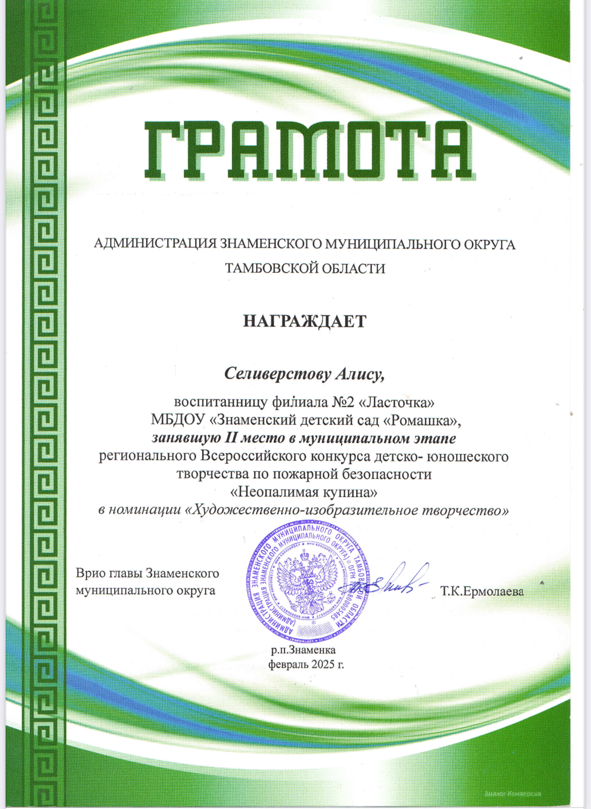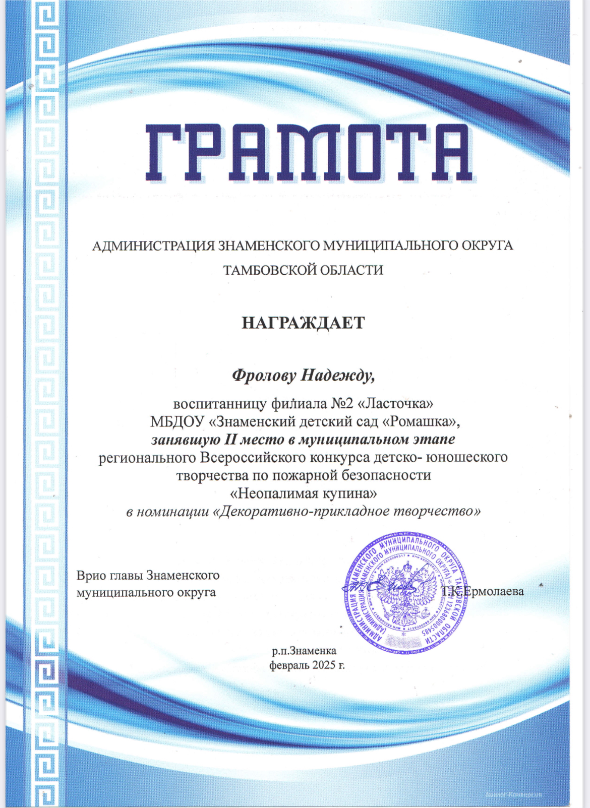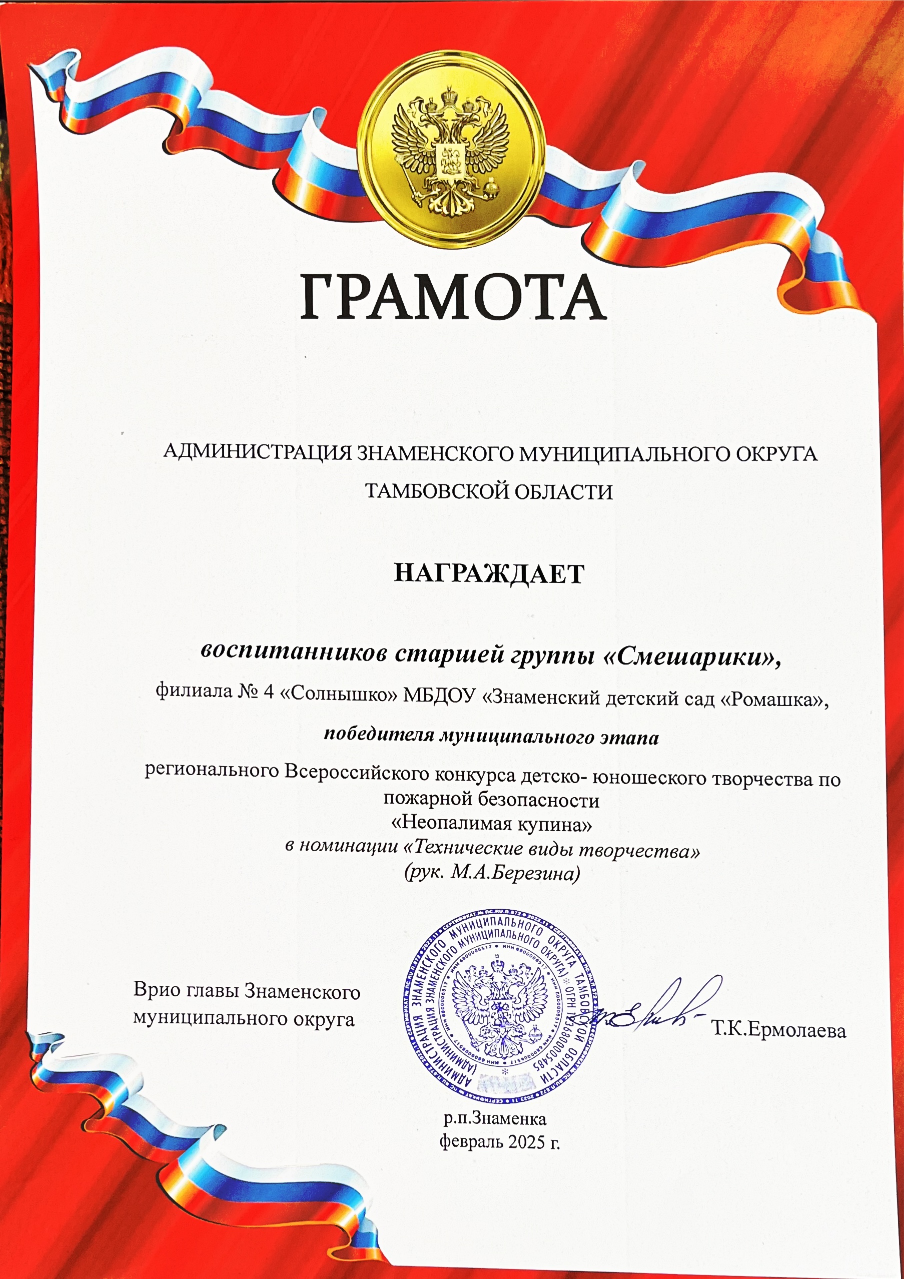 | Муниципальный этап регионального Всероссийского конкурса детско-юношеского творчества по пожарной безопасности «Неопалимая купина» в номинации «Технические виды творчества» | Воспитанники старшей группы филиала № 4 «Солнышко» МБДОУ «Знаменский детский сад «Ромашка» | Диплом победителя |