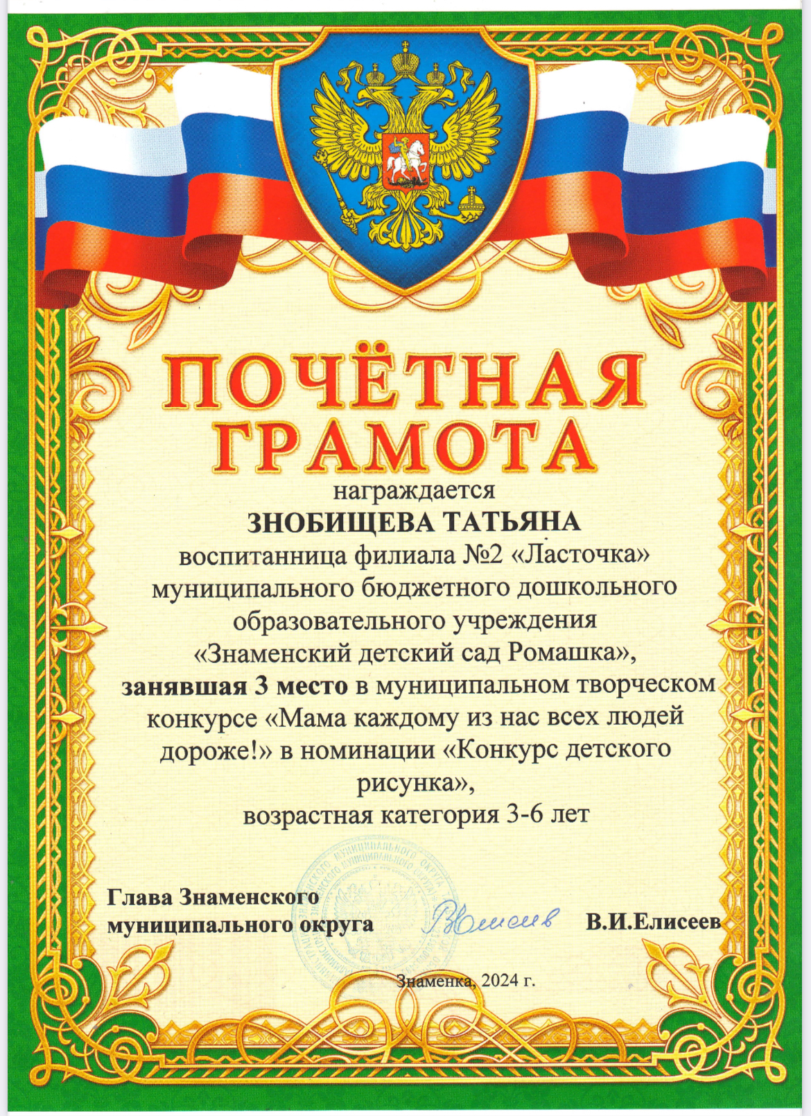 | Муниципальный творческий конкурс «Мама каждому из нас всех людей дороже!» | Знобищева Татьяна | Почетная грамота, 3 место |