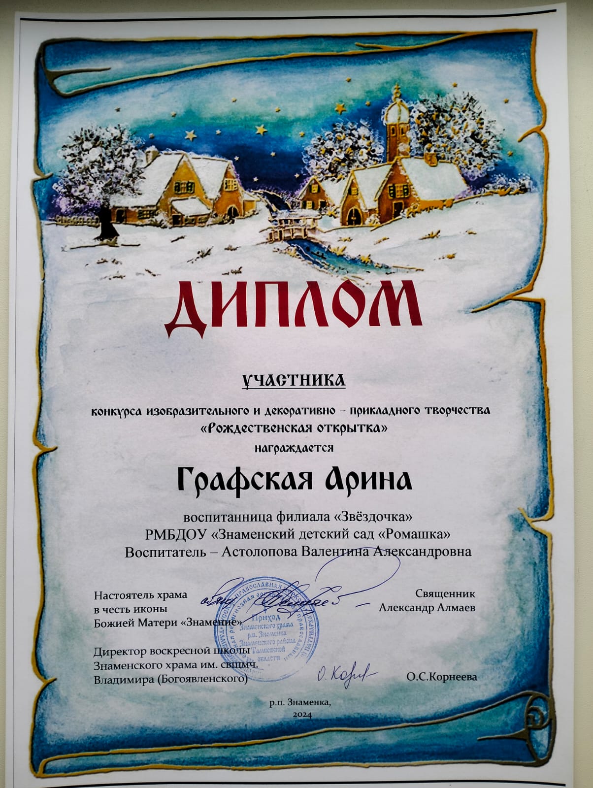 | Конкурс изобразительного декоративно-прикладного творчества «Рождественская открытка » | Графская Арина | Диплом участника |