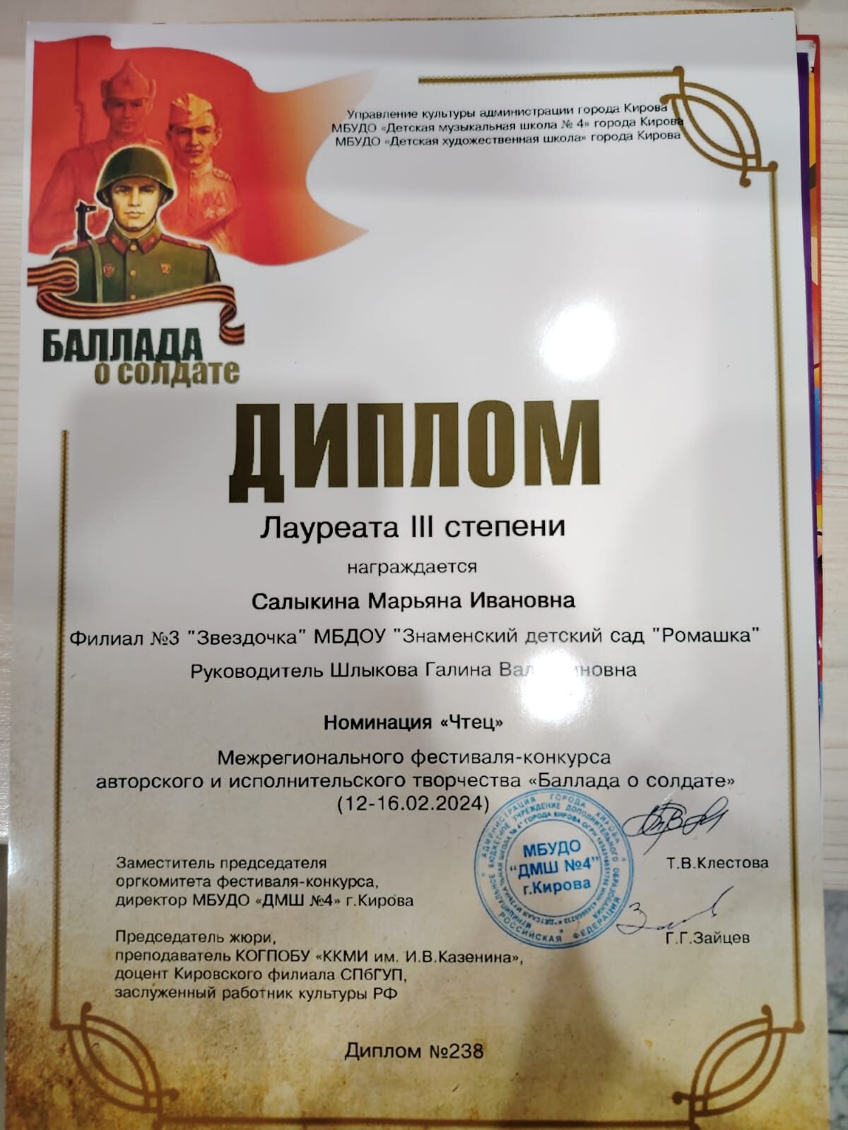 | Межрегиональный фестиваль-конкурс авторского и исполнительского творчества «Баллада о солдате» | Салыкина Марьяна | Диплом III степени |
