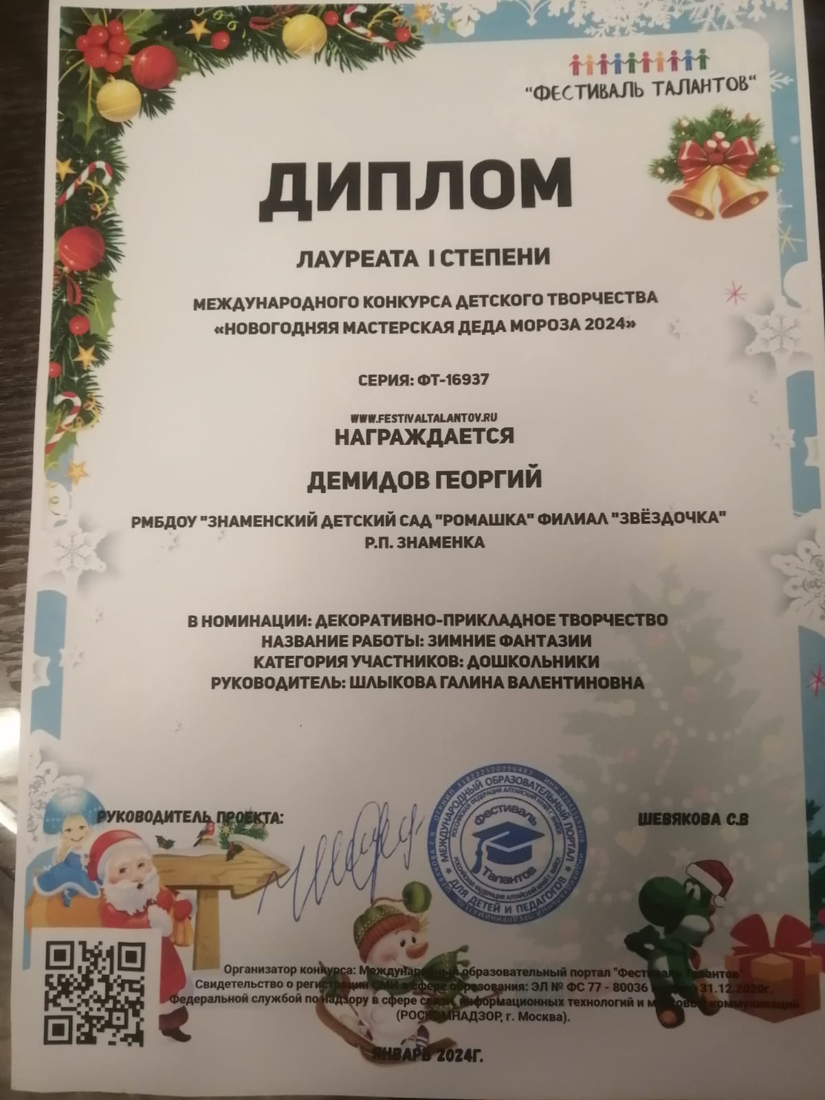 | Международный конкурс детского творчества «Новогодняя мастерская Деда Мороза 2024» | Демидов Георгий | Диплом I степени |