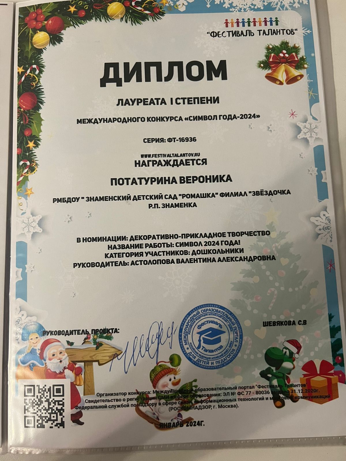| Международный конкурс «Символ года — 2024» | Потатурина Вероника | Диплом I степени |
