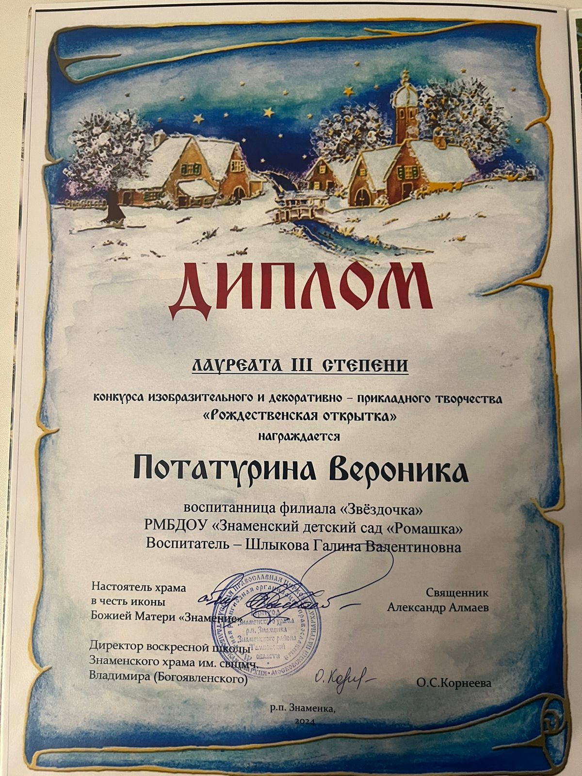 | Конкурс изобразительного декоративно-прикладного творчества «Рождественская открытка » | Потатурина Вероника | Диплом III степени |
