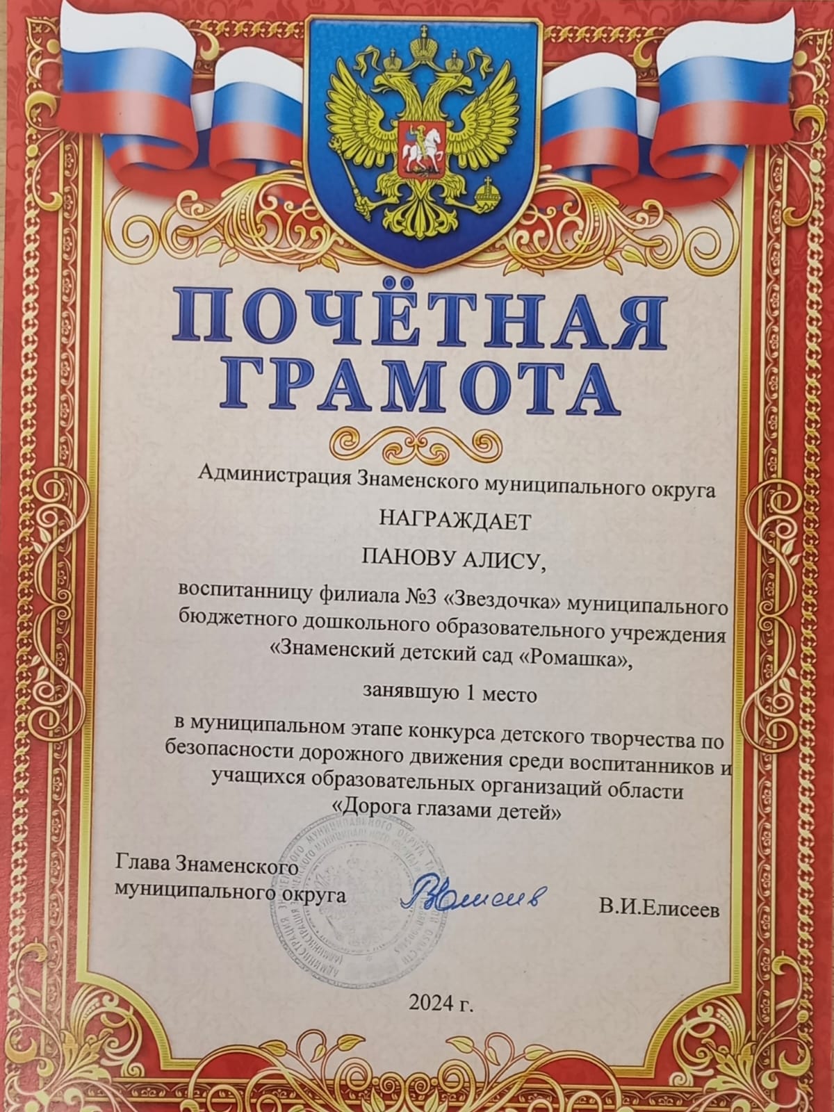 | Региональный конкурс детских рисунков «Семейный вернисаж «Соблюдаю ПДД» | Панова Алиса | Сертификат участника |