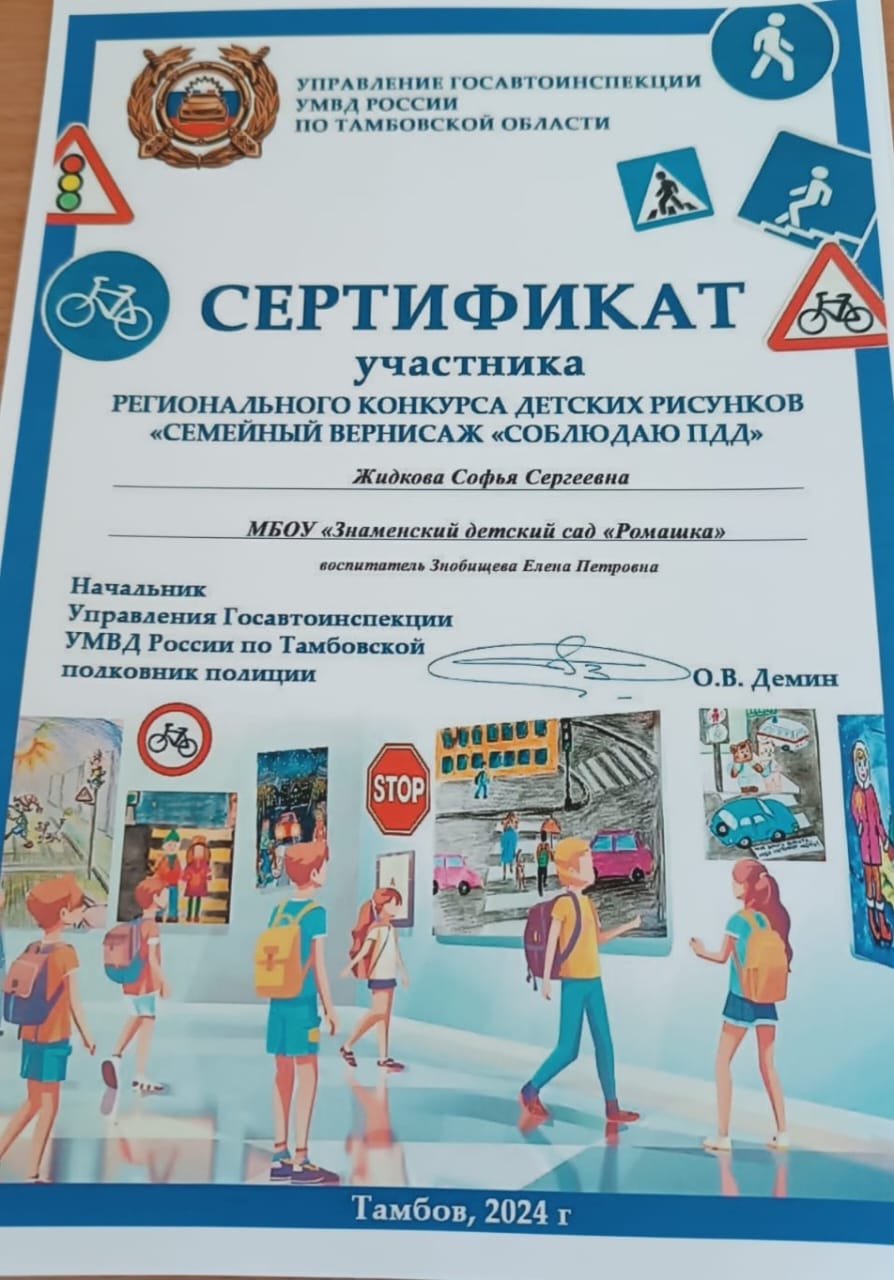 | Региональный конкурс детских рисунков «Семейный вернисаж «Соблюдаю ПДД» | Жидкова Софья | Сертификат участника |