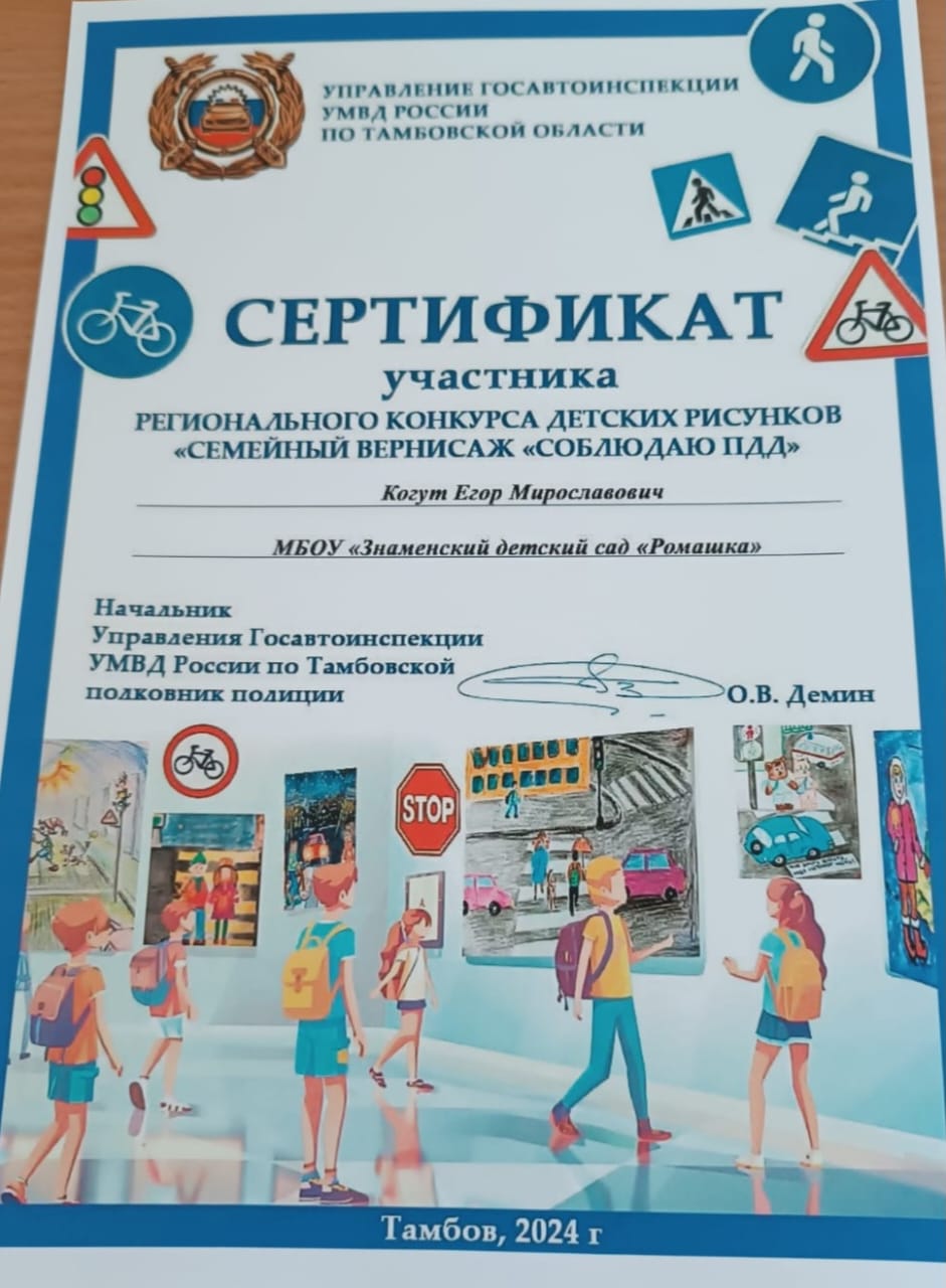 | Региональный конкурс детских рисунков «Семейный вернисаж «Соблюдаю ПДД» | Когут Егор | Сертификат участника |