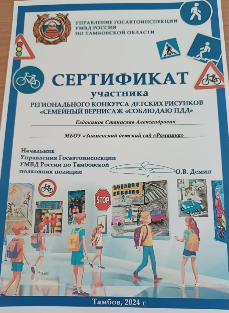 | Региональный конкурс детских рисунков «Семейный вернисаж «Соблюдаю ПДД» | Евдокимов Станислав | Сертификат участника |