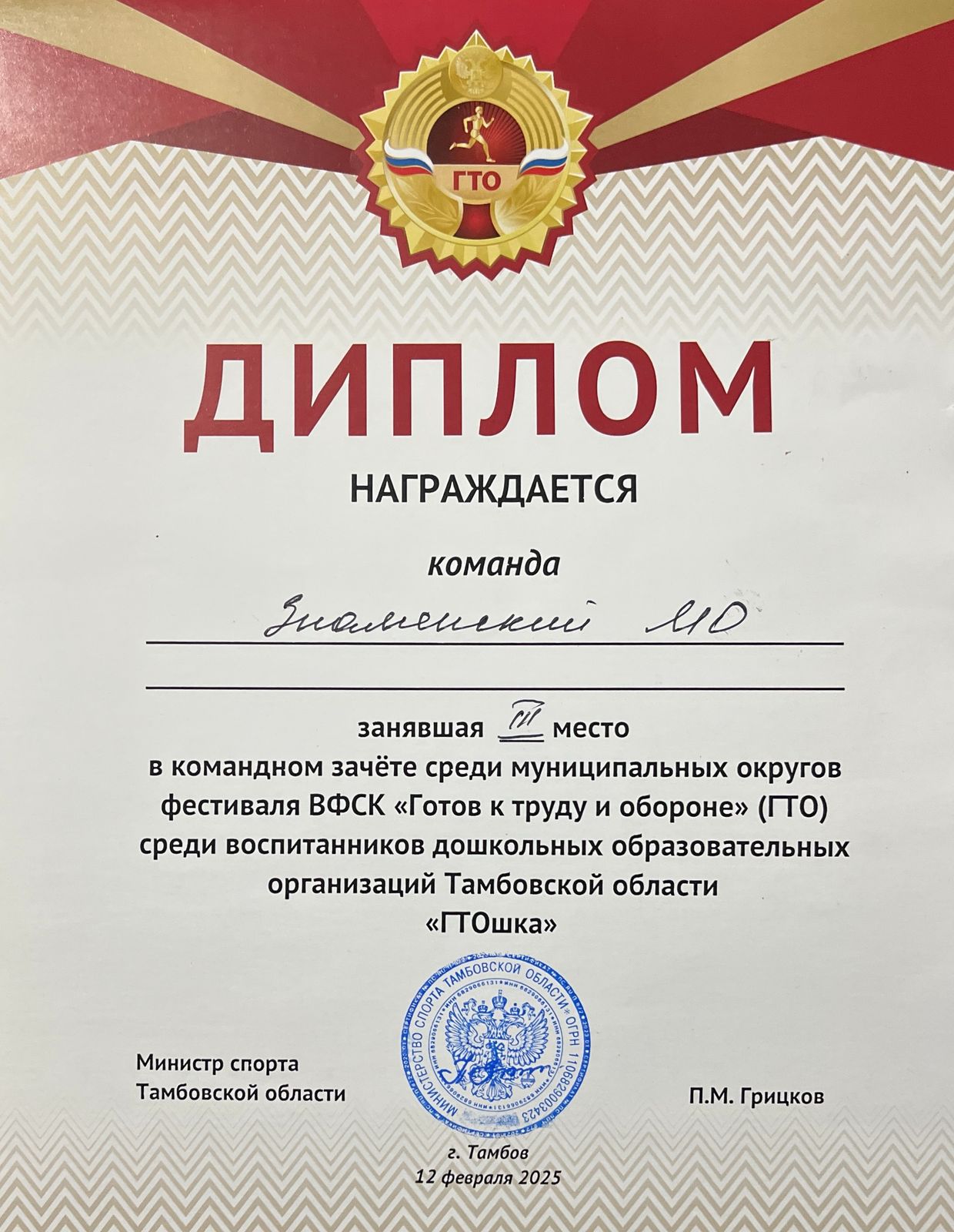 | Фестиваль ВФСК «Готов к труду и обороне (ГТО) среди воспитанников дошкольных образовательных организаций Тамбовской области (ГТОшка)» | Знаменский МО (команда филиала № 3 «Звёздочка» МБДОУ «Знаменский детский сад «Ромашка») | Диплом, 3 место |