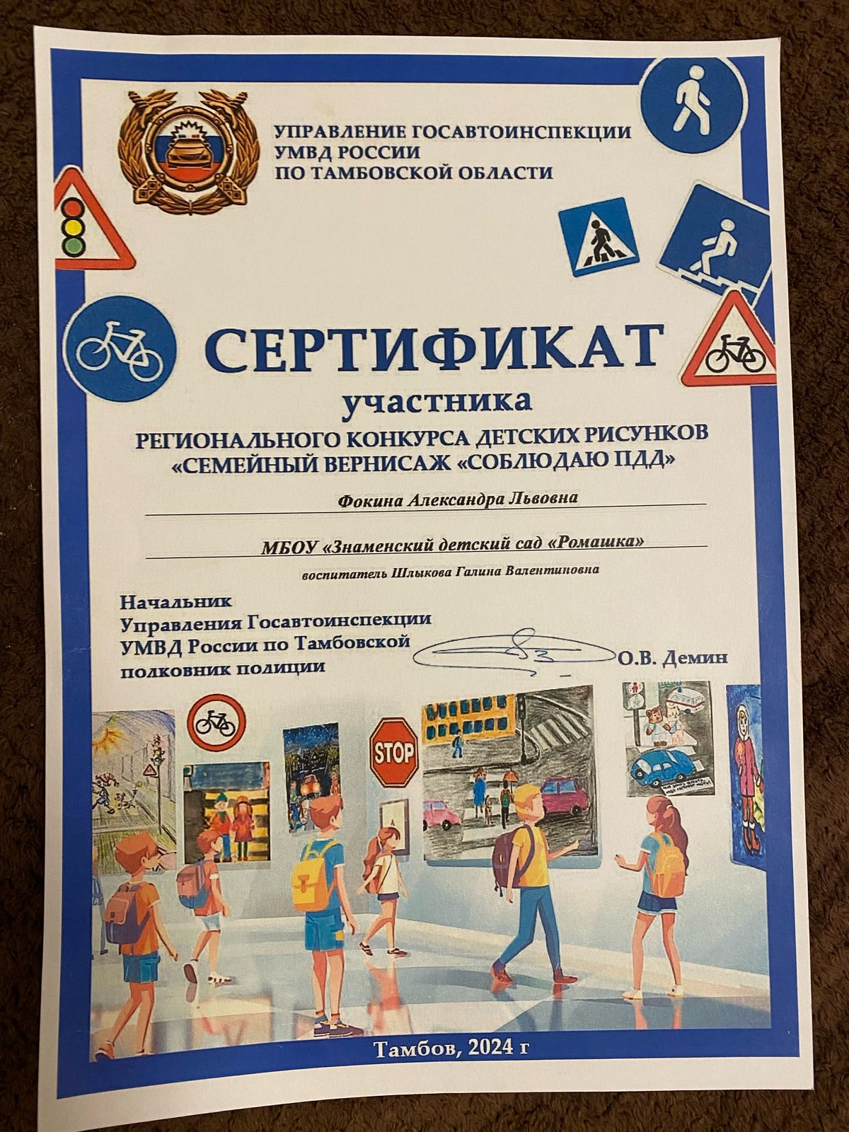 | Региональный конкурс детских рисунков «Семейный вернисаж «Соблюдаю ПДД» | Фокина Александра | Сертификат участника |