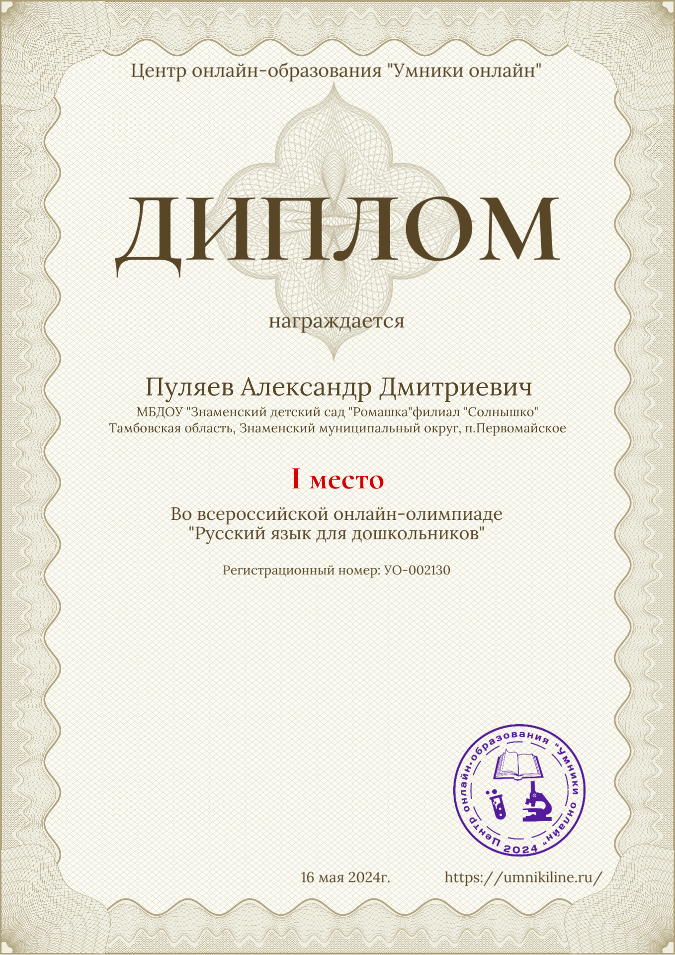 | Всероссийская онлайн-олимпиада «Русский язык для дошкольников» | Пуляев Александр | Диплом 1 место |
