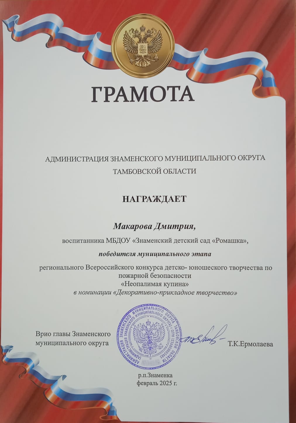 | Муниципальный этап регионального Всероссийского конкурса детско-юношеского творчества по пожарной безопасности «Неопалимая купина» в номинации «Декоративно-прикладное творчество» | Макаров Дмитрий | Победитель |