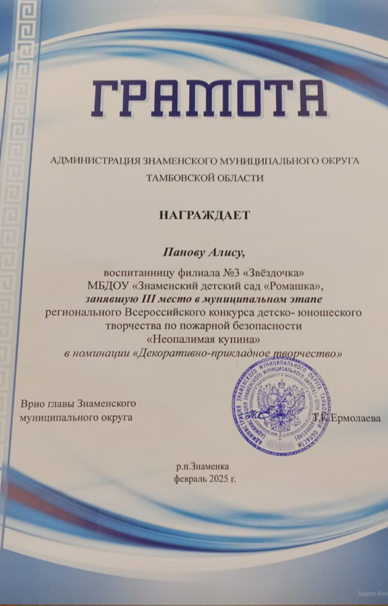 | Муниципальный этап регионального Всероссийского конкурса детско-юношеского творчества по пожарной безопасности «Неопалимая купина» в номинации «Декоративно-прикладное творчество» | Панова Алиса | 3 место |