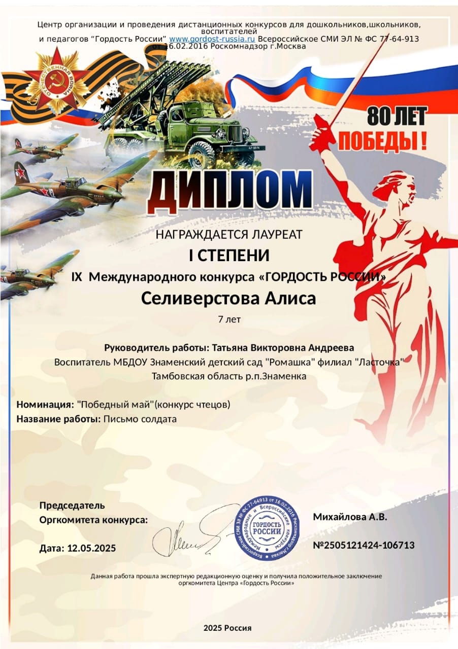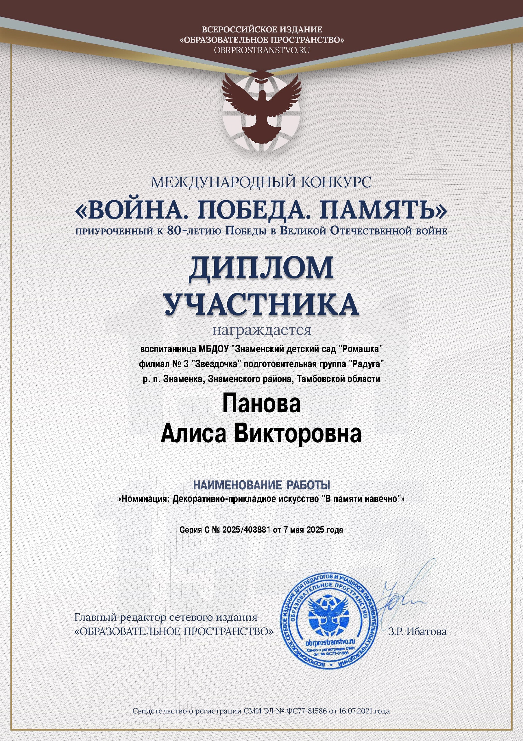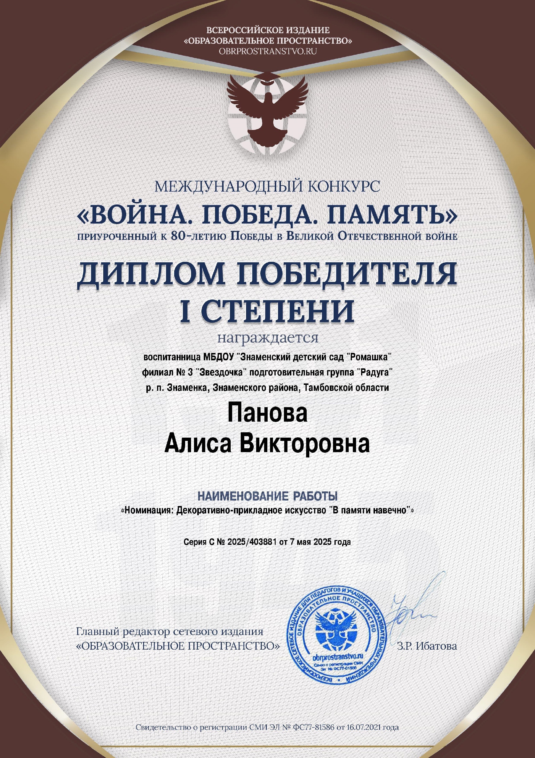 | Международный конкурс «ВОЙНА.ПОБЕДА.ПАМЯТЬ», приуроченный к 80-летию Победы в Великой Отечественной войне | Панова Алиса | |