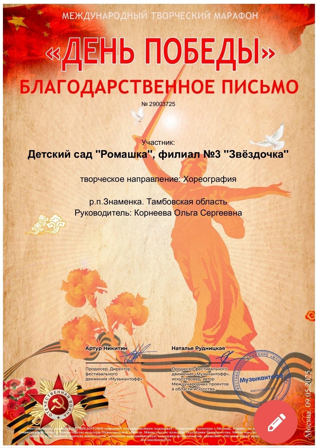 | Международный творческий марафон «ДЕНЬ ПОБЕДЫ» | Воспитанники филиала № 3 «Звёздочка» МБДОУ «Знаменский детский сад «Ромашка» | Благодарственное письмо |