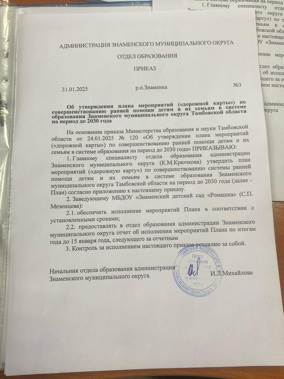 Приказ № 3 от 31.01.2025 г. отдела образования администрации Знаменского муниципального округа «Об утверждении плана мероприятий («дорожной карты») по совершенствованию ранней помощи детям и их семьям в системе образования Знаменского муниципального округа Тамбовской области на период до 2030 года»