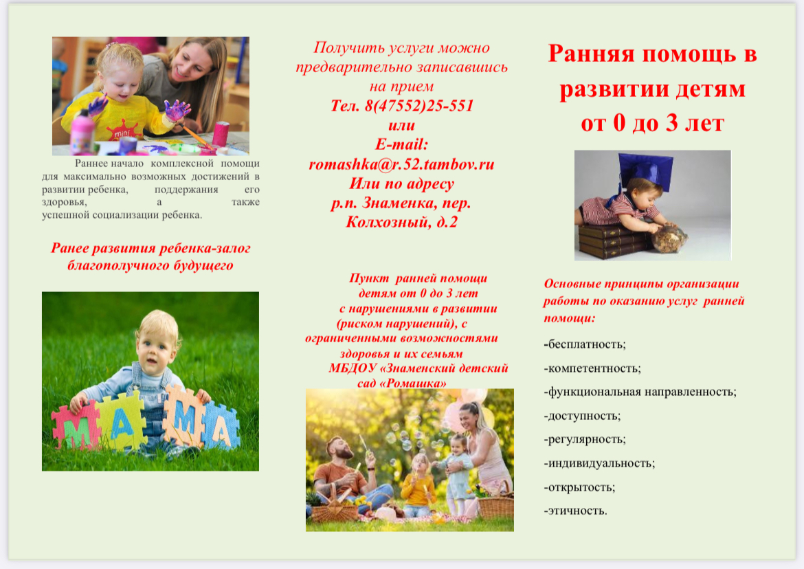 Режим работы Пункт ранней помощи для родителей (законных представителей) и детей от 0 до 3 лет с нарушениями в развитии (риском нарушений), с ограниченными возможностями здоровья на базе МБДОУ «Знаменский детский сад «Ромашка»
